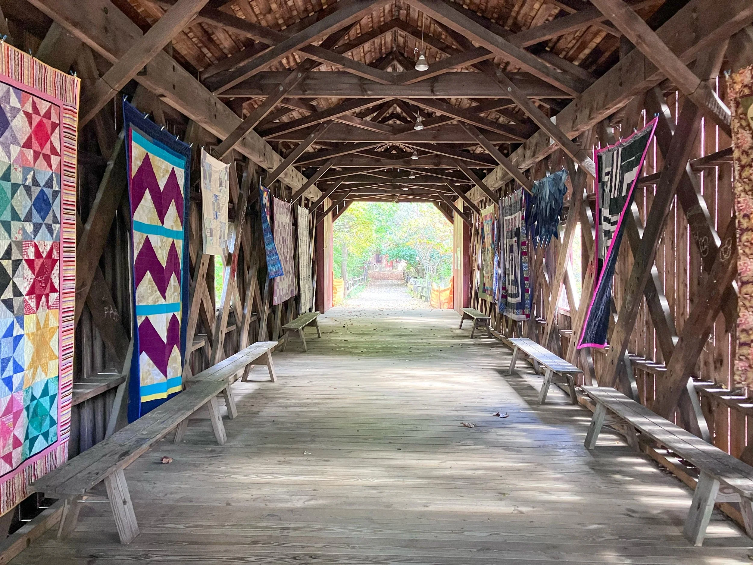 Quilt Club display at the Town Bridge, Eli Whitney Museum, October 2023.
